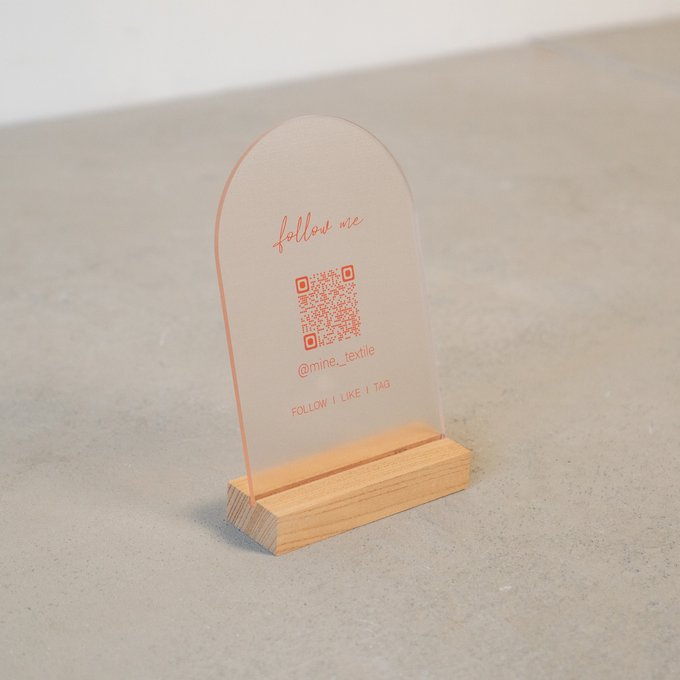 透明アクリルに、ショップ名・ロゴ・URLなどをUV印刷で表現。ブランドカラーに合わせたり、季節感を演出したり、デザインの幅が広がります。ロゴの繊細なラインや細かな文字もくっきりと印刷され、空間の中でしっかりと存在感を放ちます。