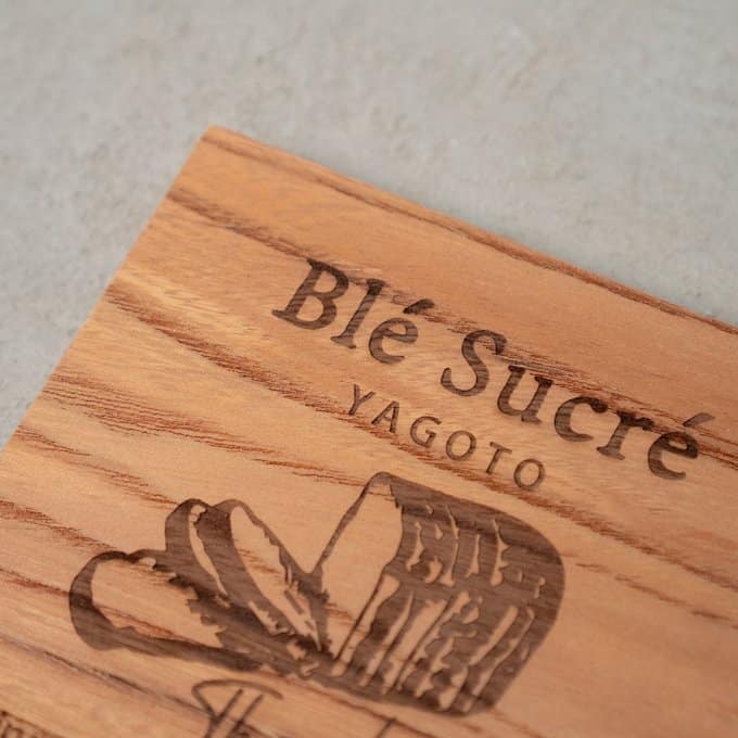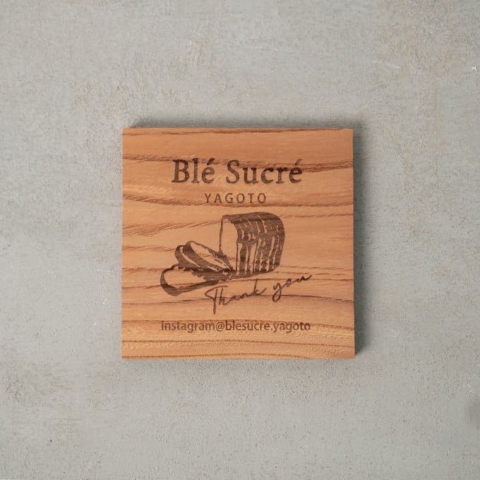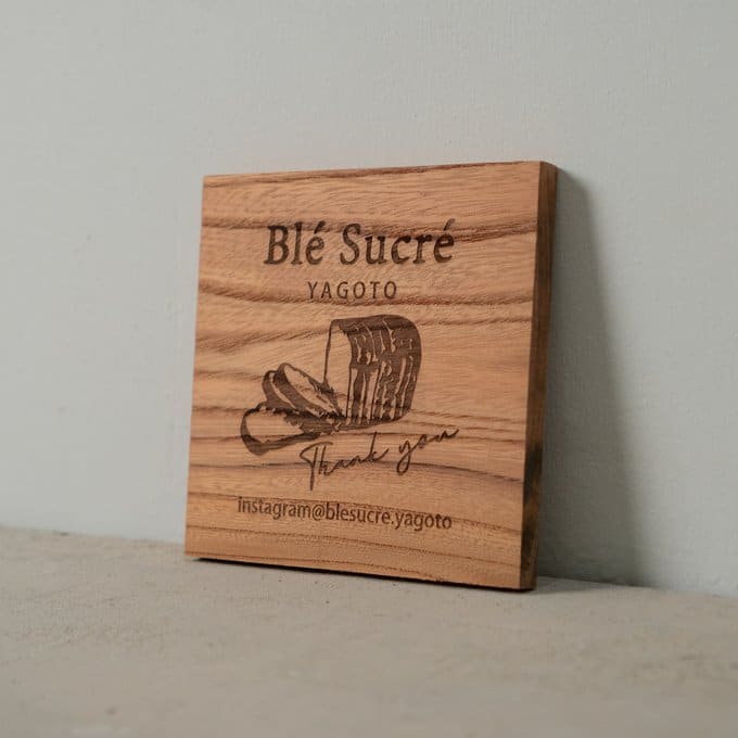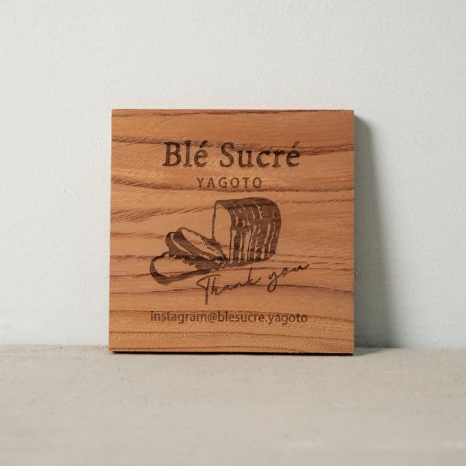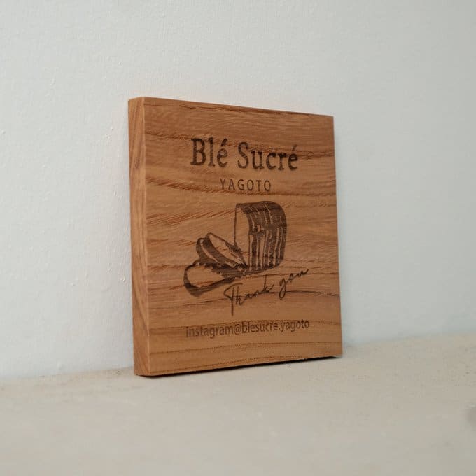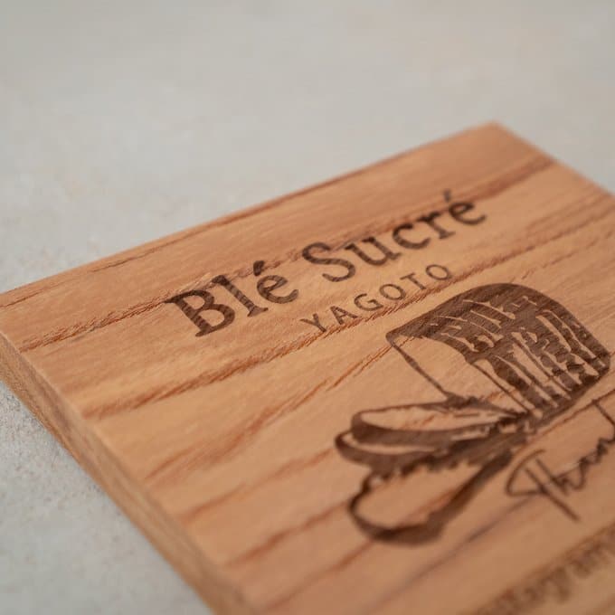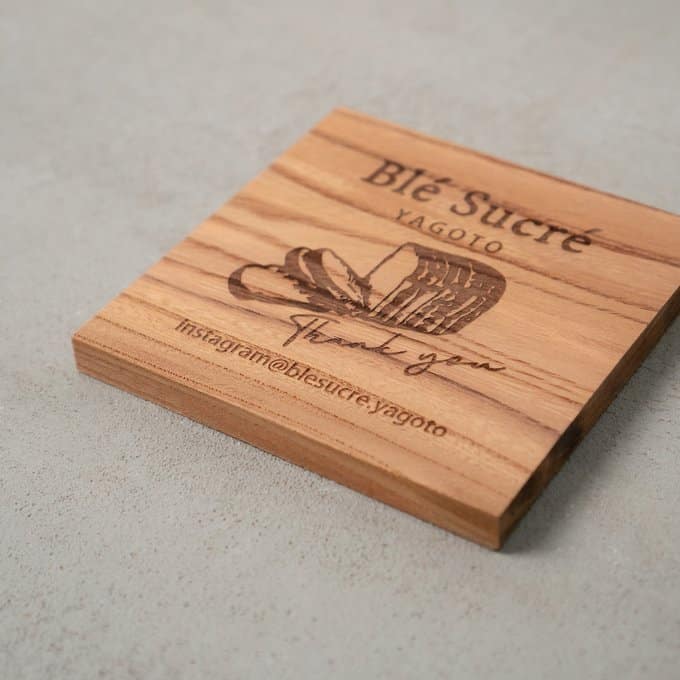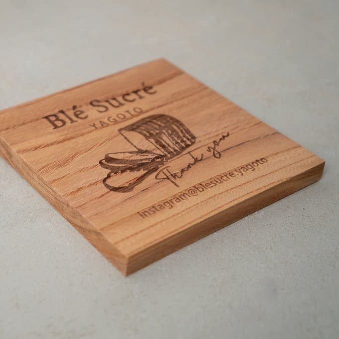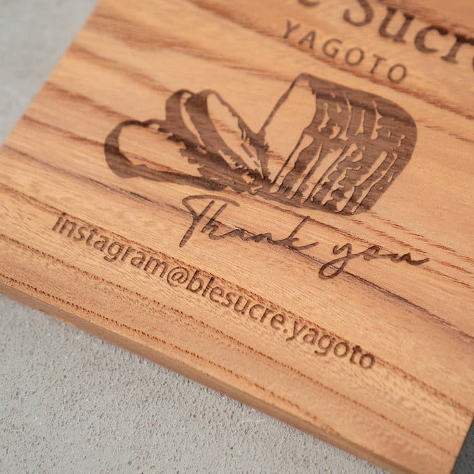 素材に使われているのは、日本でも古くから親しまれてきた高級木材・ケヤキ。硬質でありながら加工性にも優れ、表面には自然な艶と豊かな表情が広がります。その木肌に、レーザー加工機によってロゴやテキスト、メッセージなどを丁寧に彫刻。焼き付けるように刻まれた文字は、印刷では味わえない立体感と陰影を生み、見るたびにぬくもりを感じさせます。